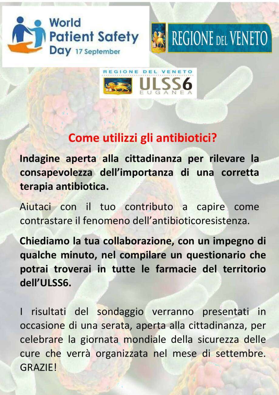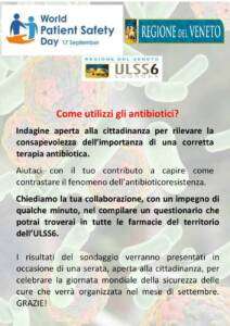 L’iniziativa rientra nell’ambito della Giornata Mondiale della Sicurezza dei Pazienti (World Patient Safety Day) istituita dall’Organizzazione Mondiale per la Sanità per la prima volta il 17 settembre del 2019. Quest’anno il tema principale è “coinvolgere i pazienti per la sicurezza dei pazienti”; proprio in quest’ottica di coinvolgimento diffuso, rivolto non solo ai professionisti della sanità ma anche agli assistiti, la Regione Veneto – in collaborazione con il Servizio Rischio Clinico di Azienda Zero – ha predisposto un questionario dedicato ai cittadini per indagare la loro conoscenza rispetto al corretto uso degli antibiotici.