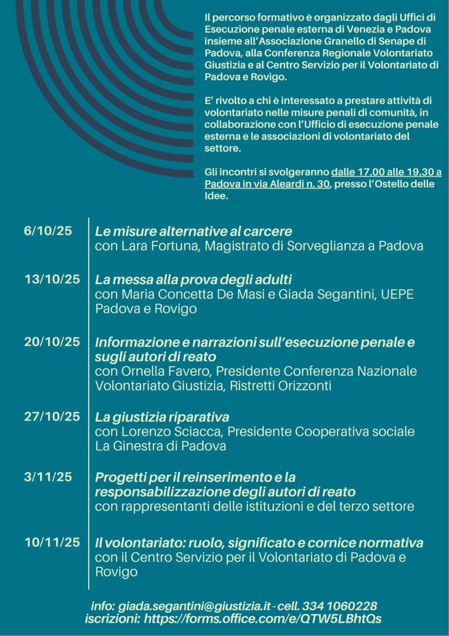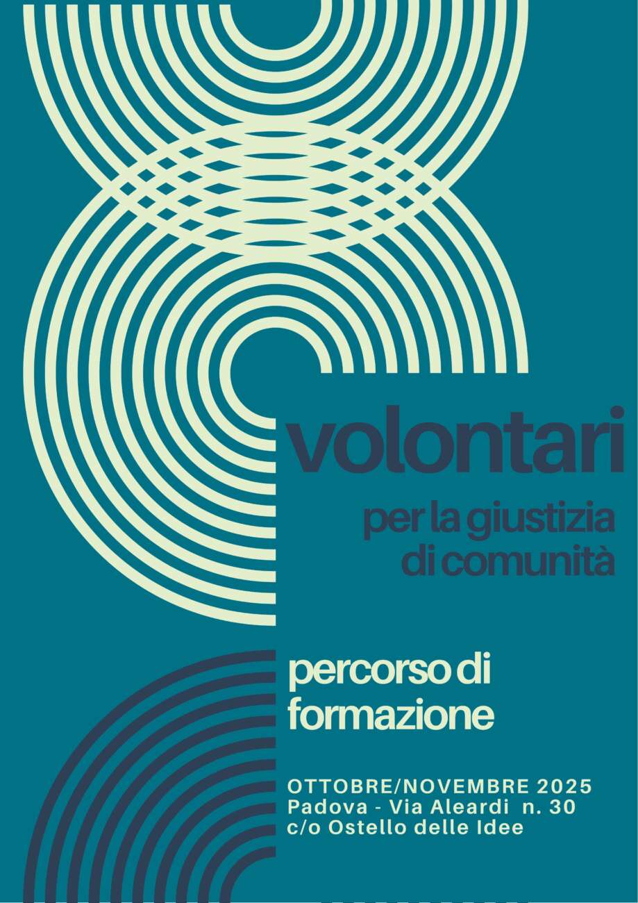 “Volontari per la Giustizia di Comunità”: un percorso formativo per diventare volontari nell’esecuzione penale esterna “Volontari per la Giustizia di Comunità”: un percorso formativo per diventare volontari nell’esecuzione penale esternaUn nuovo percorso formativo dedicato a chi desidera impegnarsi come volontario nel settore della giustizia di comunità sta per partire a Padova. Il corso “Volontari per la giustizia di comunità” si svolgerà tra ottobre e novembre 2025 presso l’Ostello delle Idee (via Aleardi 30, Padova), con incontri programmati ogni lunedì dalle 17.00 alle 19.30.