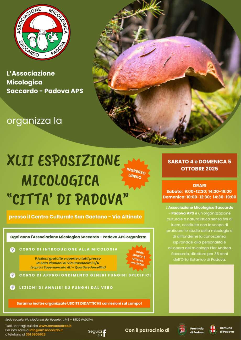 L’Associazione Micologica Saccardo Padova ripropone l’esposizione micologica ad ingresso libero nel primo weekend di ottobre