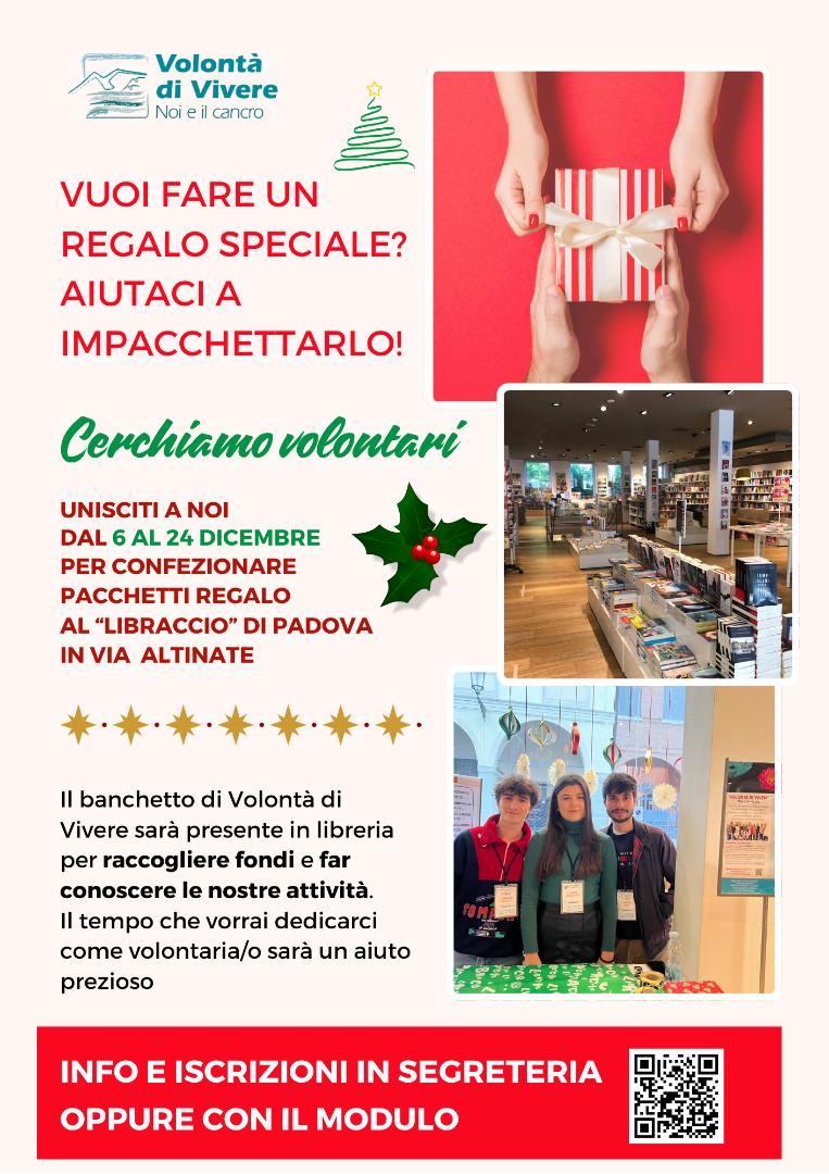 Con l’arrivo delle festività natalizie, l’Associazione Volontà di Vivere si prepara a tornare al fianco della comunità con un’iniziativa solidale che unisce spirito natalizio e impegno sociale. Da sabato 6 a mercoledì 24 dicembre, l’associazione sarà presente presso la libreria Il Libraccio in Via Altinate a Padova per confezionare pacchetti regalo per i clienti.
