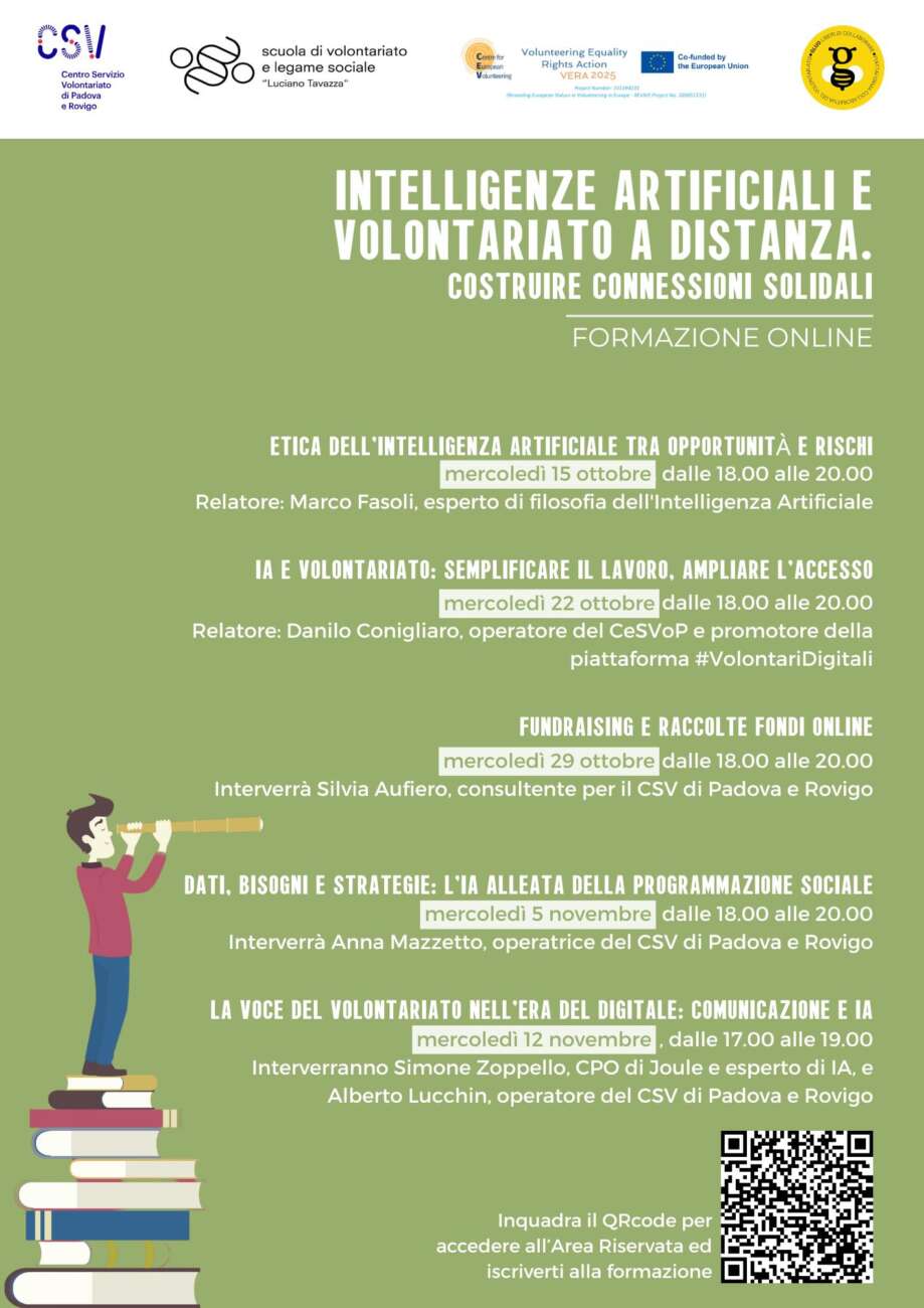 Nell’ambito della Scuola di Volontariato e Legame Sociale “Luciano Tavazza” e del progetto europeo VERA 2025 – Volunteering Equality Rights Action, il CSV di Padova e Rovigo promuove un percorso formativo online dedicato a un tema quanto mai attuale: l’intelligenza artificiale e il suo impatto sul mondo del volontariato a distanza.