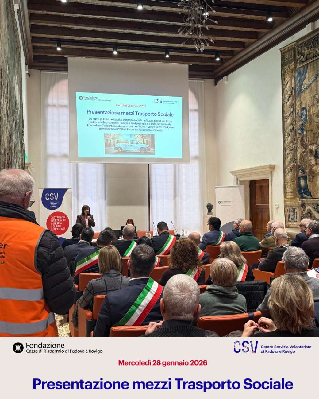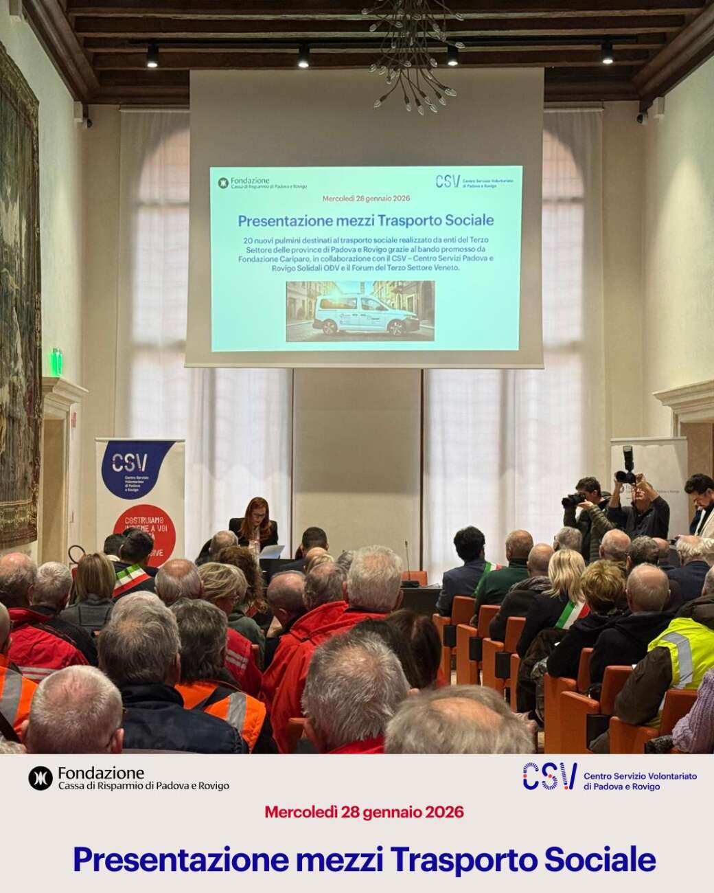 Consegnati i 20 nuovi mezzi per il progetto STACCO: 13 mezzi destinati ad associazioni polesane, 7 le associazioni padovane. Alla cerimonia, svoltasi il 28 gennaio 2026, presenti i vertici della Fondazione Cariparo e del CSV Padova Rovigo.