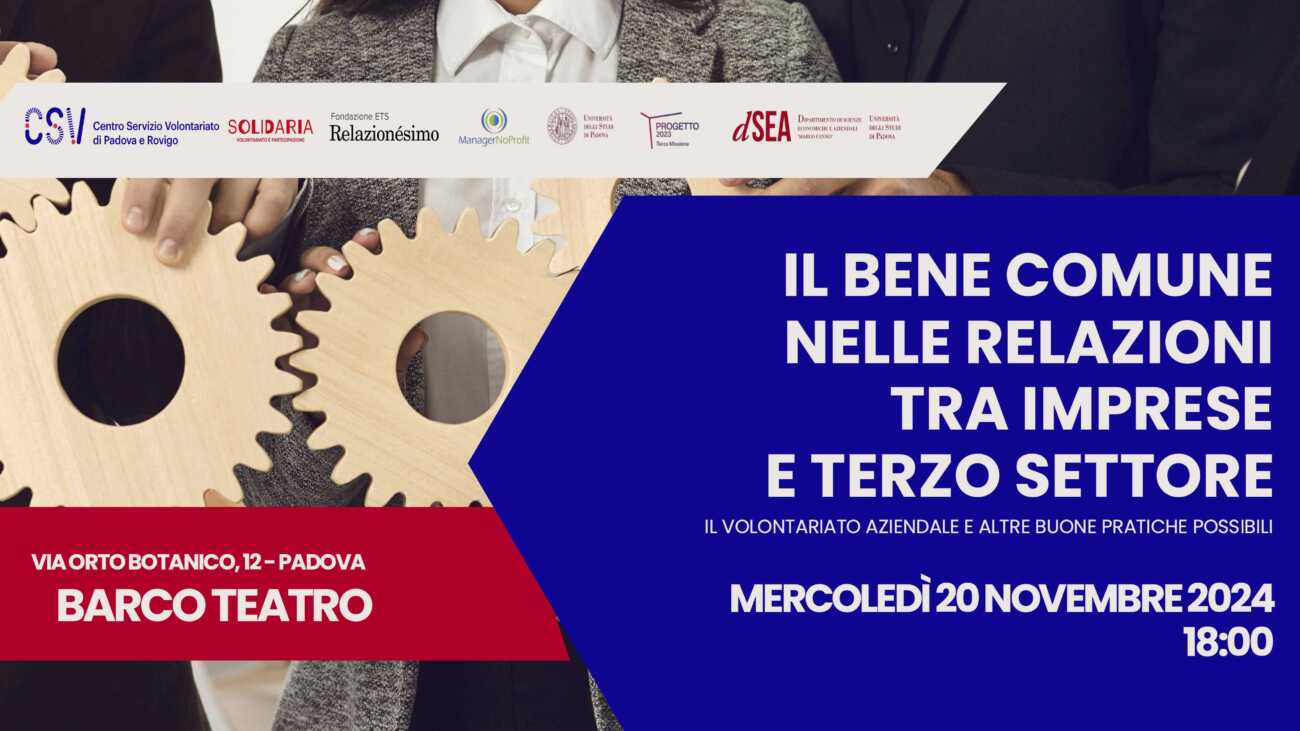 Mercoledì 20 novembre, il Barco Teatro di Padova ha ospitato l’evento “Il bene comune nelle relazioni tra imprese e Terzo Settore. Il volontariato aziendale e altre buone pratiche possibili”, promosso dal CSV di Padova e Rovigo. Un’occasione unica per esplorare il valore strategico delle relazioni tra imprese e Terzo Settore, con particolare attenzione al volontariato aziendale come strumento di responsabilità sociale d’impresa (CSR) e di coesione comunitaria.